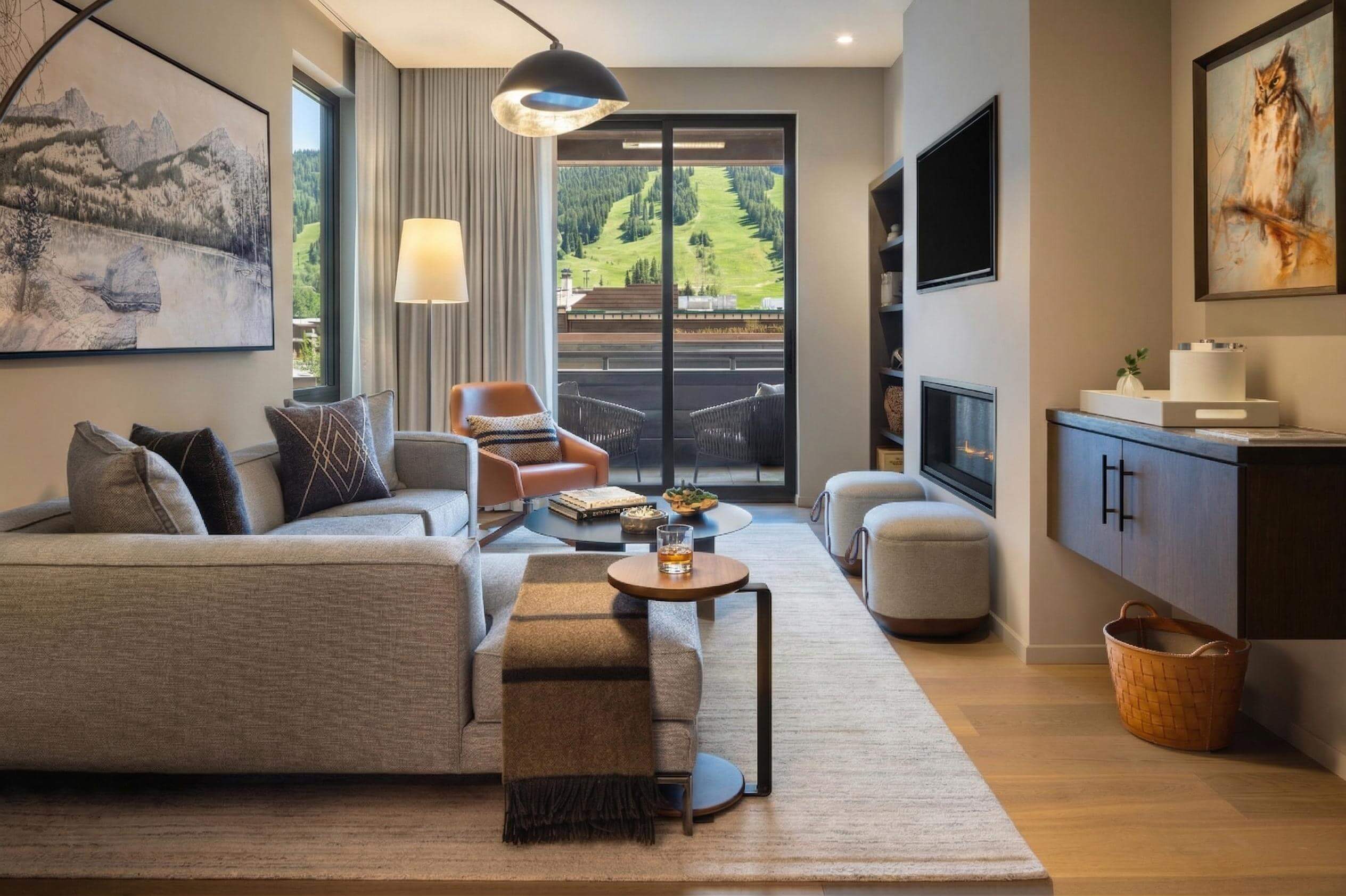 A spacious living room sets the tone for effortless lounging and conversation, with ample seating for unhurried evenings. Step onto your private, fire-lit balcony — an intimate vantage for crisp mountain nights and four-season enjoyment overlooking Town Square and the slopes of Snow King Resort in the distance.