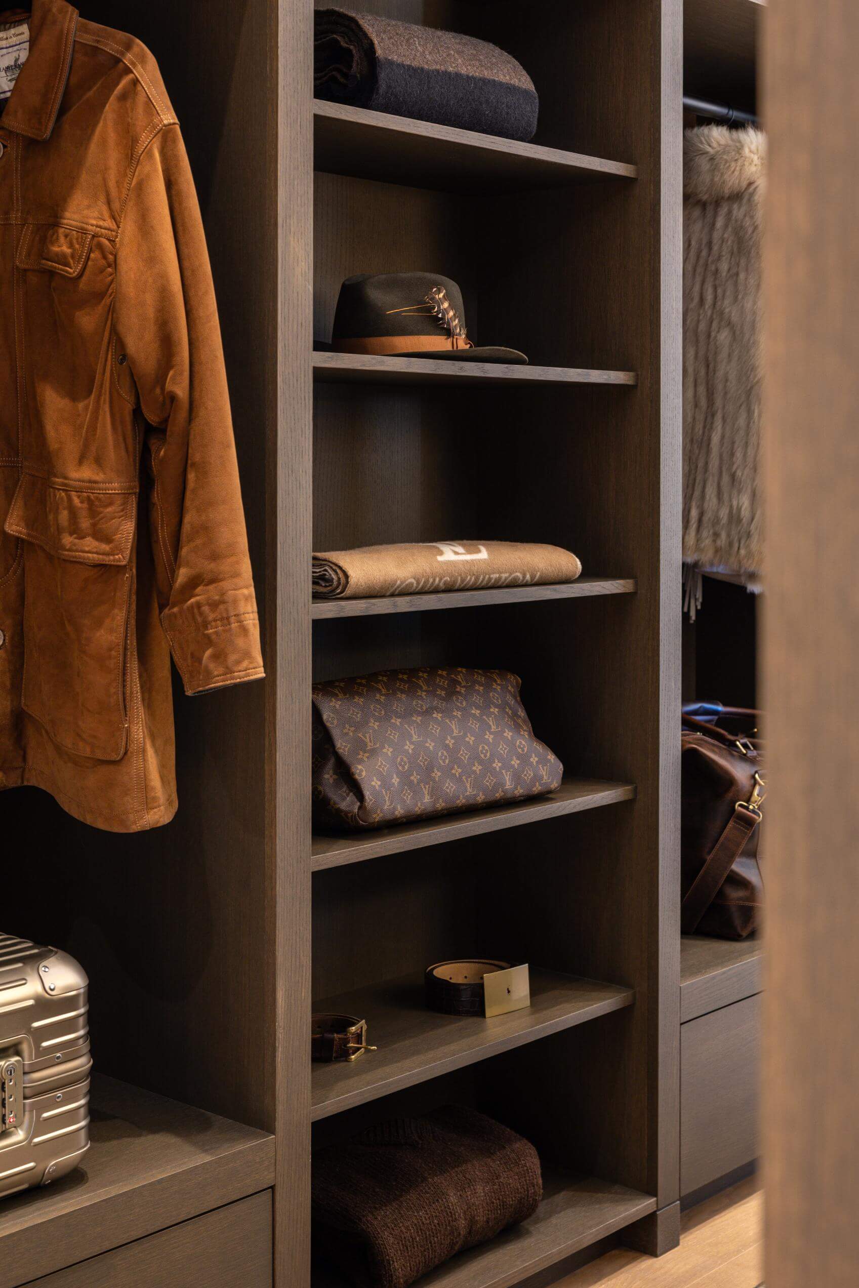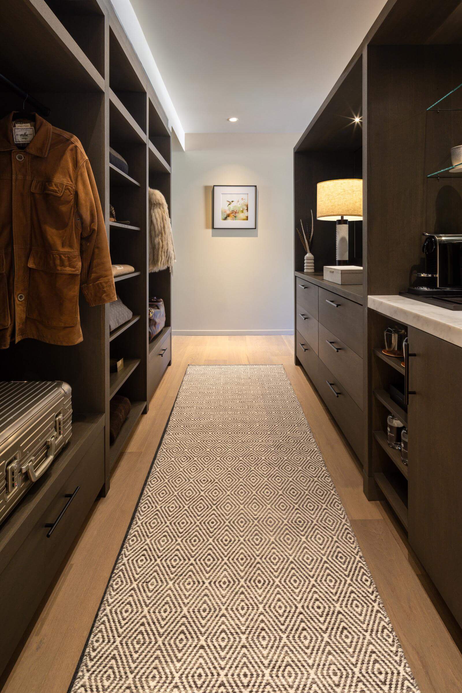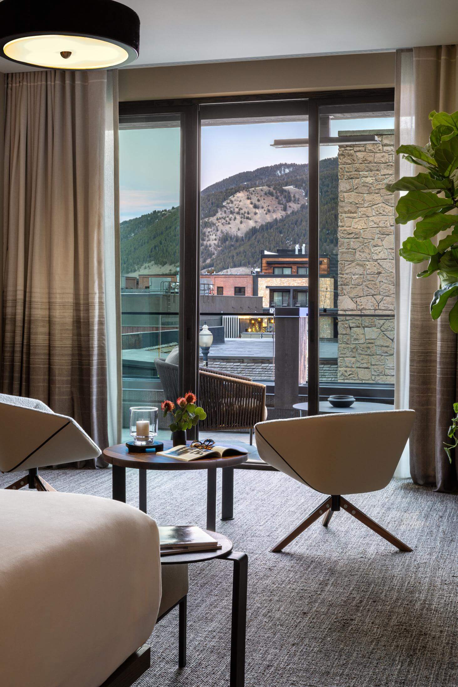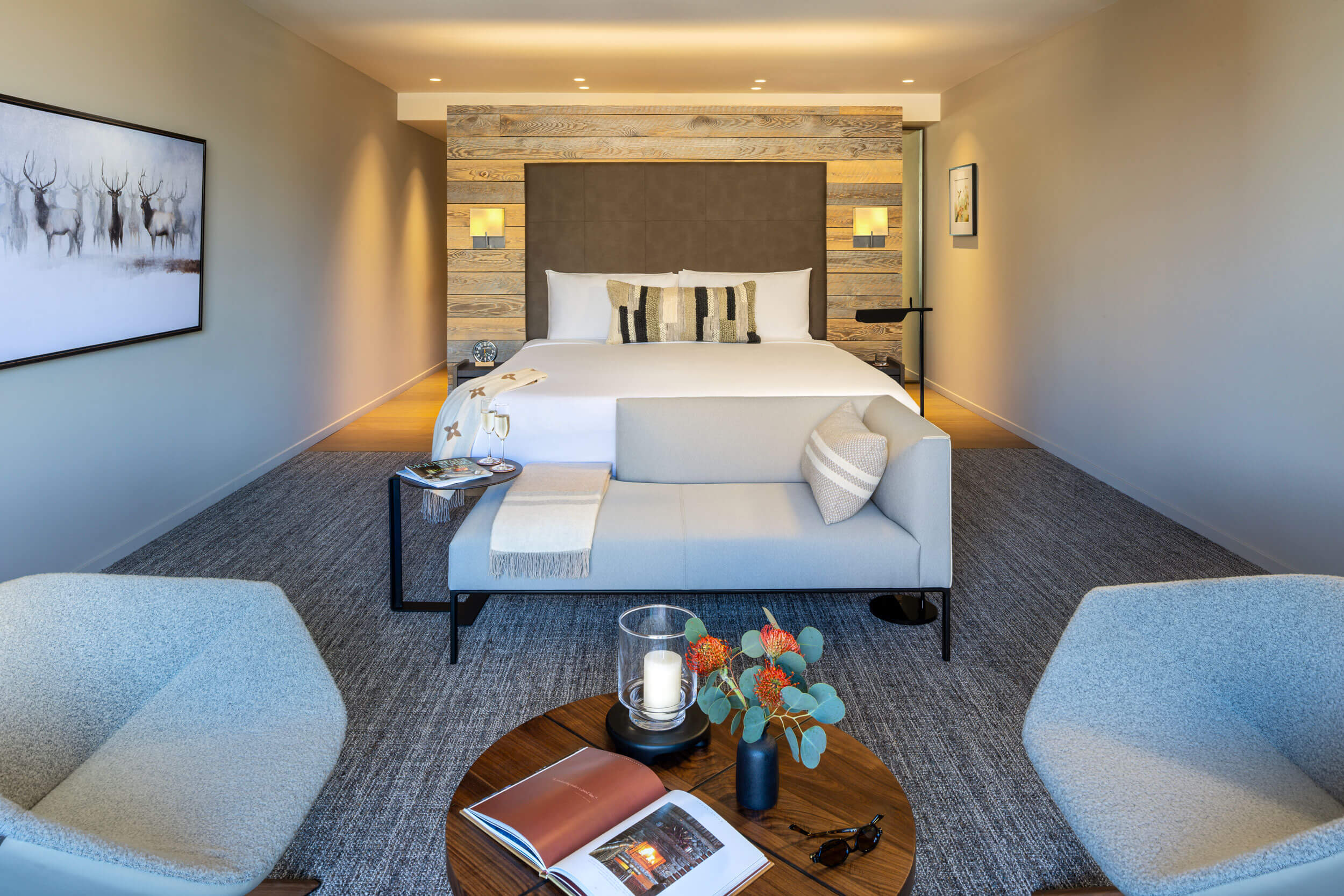 These three suites can be enjoyed individually or combined for one three-room complex joined by a private locked hallway. Each suite unfolds in three beautifully articulated zones: a bedroom sanctuary with wall-to-wall glass that opens onto a private balcony; inviting indoor and outdoor seating areas—each with its own gas fireplace—for year-round warmth and conversation; and a refined dressing area with a wide vanity, illuminated mirror, and generous closets for every sartorial detail. Completing the experience, an expansive, spa-like bathroom centers on a large walk-in shower—restorative and serene after a day on the trails or the slopes.