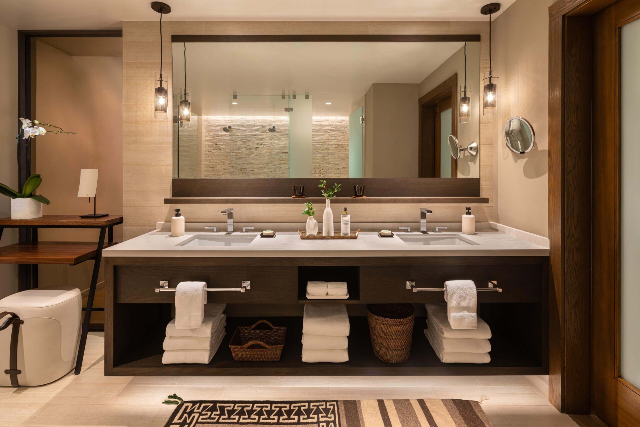 Wash the day away in a spa inspired bathroom complete with plush bathrobes and indulgent BVLGARI and L’Occitane spa products.
